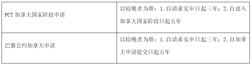 實審必須在加拿大申請日后四年內請求并支付審查費。因此,對于PCT國家階段申請,如果該PCT申請要求了優(yōu)先權,審查請求可以推遲到進入加拿大國家階段后30個月內提出。分案申請的規(guī)則有所不同,分案申請可以在母案授權前一天提交,并且可以提交“多代”分案申請。分案申請的審查請求和費用須在最早母案申請日起四年或分案申請“提交日”后三個月內(以較晚者為準)提交。