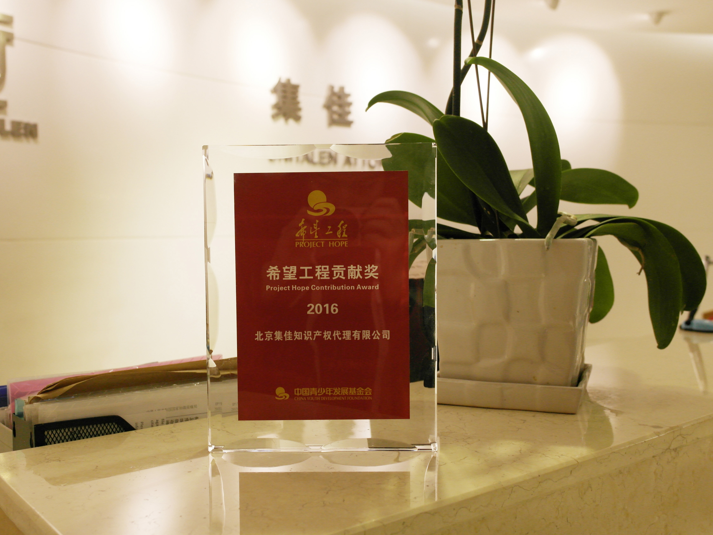 日前,中國青少年發(fā)展基金會向北京集佳知識產(chǎn)權(quán)代理有限公司頒發(fā)了“希望工程2016貢獻(xiàn)獎”,以表彰集佳在剛剛過去的2016年,對貧困地區(qū)兒童教育的愛心捐助和對國家希望工程事業(yè)的巨大支持。此外,青基會在《中國青年報》刊發(fā)整版鳴謝,在新年到來之際,對奔馳、國開行、可口可樂、集佳等近90家單位和合作方致以衷心的感謝。