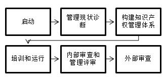 目前貫標(biāo)輔導(dǎo)咨詢,市場份額占比較大的有兩種模式:一種是基于咨詢機(jī)構(gòu)提供的一套符合國家標(biāo)準(zhǔn)的模板,企業(yè)根據(jù)知識產(chǎn)權(quán)的自身運(yùn)作形成記錄文件后爭取第三方認(rèn)可;另一種,是在咨詢機(jī)構(gòu)的全程輔導(dǎo)下,完成啟動、管理現(xiàn)狀診斷、構(gòu)建知識產(chǎn)權(quán)管理體系、培訓(xùn)和運(yùn)行、內(nèi)部審查和管理評審、外部審查6個模塊(見圖1),系統(tǒng)的構(gòu)建知識產(chǎn)權(quán)管理體系。