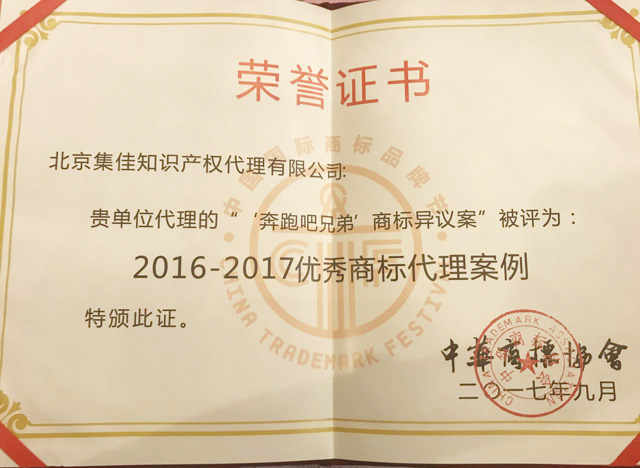 9月3日,正在桂林舉行的2017中國(guó)國(guó)際商標(biāo)品牌節(jié)再傳捷報(bào),由集佳知識(shí)產(chǎn)權(quán)代理有限公司代理的“奔跑吧兄弟”商標(biāo)異議案獲評(píng)“2016-2017優(yōu)秀商標(biāo)代理案例”。
