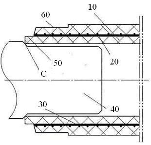 如圖2所示,對比文件1的具體方案為:包括直管10,設(shè)于直管10內(nèi)的以緯線20和經(jīng)線30組成的鋼網(wǎng)骨架,設(shè)于直管10一端外側(cè)的封位60,位于所述封位60一端的直管10外側(cè)還設(shè)有去除緯線20和經(jīng)線30的臺階50。
