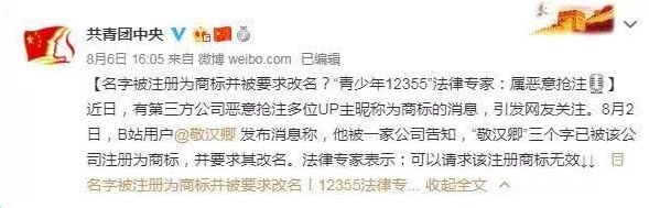 2019年8月3日,一條題為《我被告知跟我22年的名字我不能用要我改名!我如何維權(quán)的!》的網(wǎng)絡(luò)視頻在B站上引發(fā)網(wǎng)友關(guān)注,視頻發(fā)布人是UP主“敬漢卿”。在視頻中“敬漢卿”吐槽,自己用了22年的名字被他人惡意搶注,對方還給自己發(fā)了相關(guān)證明材料,要求其支付“敬漢卿”的商標購買費用或停止使用“敬漢卿”的名字。截至2019年8月6日10時,相關(guān)視頻瀏覽量已突破1400萬,近20萬網(wǎng)友參與線上討論。敬漢卿表示,他已經(jīng)向有關(guān)部門遞交了商標無效申請,并正在搜集材料控告被異議人惡意搶注。