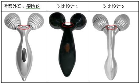 請求人主張,將證據(jù)1組合證據(jù)2的兩個(gè)按摩球中間的凸出部位,涉案專利與上述證據(jù)的組合相比不具有明顯區(qū)別。焦點(diǎn)問題在于,盡管證據(jù)2的兩個(gè)按摩球中間具有明顯可見的凸出部分,且形狀與證據(jù)1的按摩球中間外凸形狀一致,但是否可以作為設(shè)計(jì)特征與對比設(shè)計(jì)1進(jìn)行組合。