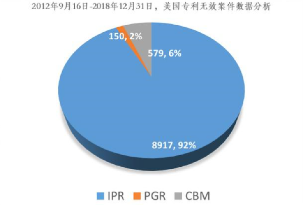5、根據(jù)USPTO(美國(guó)專利商標(biāo)局)公布的2012年9月16日至2018年12月31日美國(guó)專利無效案件數(shù)據(jù),在IPR、PGR、CBMR三種無效(復(fù)議)程序中,IPR占比最多,高達(dá)92%,合計(jì)為8917件;IPR較少,占比僅為2%,合計(jì)150件。從目前的數(shù)據(jù)觀察,IPR是上述三種無效(復(fù)議)程序中最受歡迎的方式。