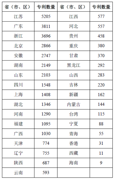 申請(qǐng)專利數(shù)量越多的省市,在該領(lǐng)域相對(duì)更加重視,也擁有更好的技術(shù)優(yōu)勢(shì)。從表2可知,申請(qǐng)量排名前五的省市依次為江蘇(5205件)、廣東(3811件)、浙江(3696件)、北京(2866件)和安徽(2747件),這五省市總計(jì)申請(qǐng)了18325件,占據(jù)分析專利總量的半壁江山(49.7%)。申請(qǐng)量前十的省市則占到了分析專利總量的72.9%(26879件),并且西部地區(qū)僅有四川(1548件)躋身申請(qǐng)量前十。