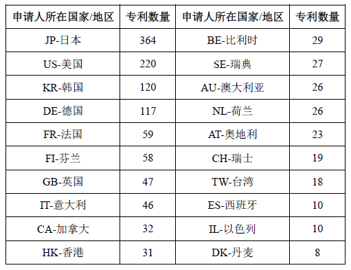 表3 在華申請(qǐng)量分布(申請(qǐng)量排名前20位)