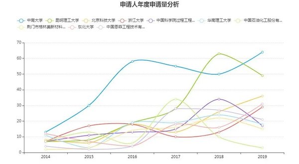 分年度看,如圖5,申請(qǐng)人在近些年的申請(qǐng)趨勢(shì)總體變化不大。其中中國石油化工股份有限公司的申請(qǐng)量在2017年達(dá)到高峰后,近兩年有所下降;而昆明理工大學(xué)在2017年之后、浙江大學(xué)和東北大學(xué)在2018年之后都有明顯的發(fā)力,這可能表明各個(gè)申請(qǐng)人在相應(yīng)領(lǐng)域的研發(fā)成果有所波動(dòng),其更深的后果有待更多觀察。