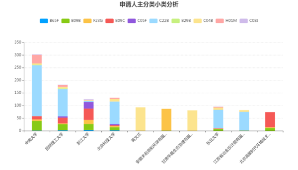 安徽未名鼎和環(huán)保有限公司的申請(qǐng)全部為F23G(焚化爐;廢物或低品位燃料的焚毀),這和該公司的主營業(yè)務(wù)(生活垃圾熱解)保持一致。浙江大學(xué)、北京高能時(shí)代環(huán)境技術(shù)股份有限公司的專利申請(qǐng)以B09C(污染的土壤的再生)為主。值得注意的是,在本小節(jié)分析的十個(gè)主體中,浙江大學(xué)的技術(shù)分類分散程度最高,顯示出其在多個(gè)技術(shù)方向上的發(fā)展較為均衡,體現(xiàn)出較強(qiáng)的綜合實(shí)力。此外,據(jù)查詢,高能時(shí)代公司是土壤修復(fù)產(chǎn)業(yè)的龍頭公司,其在污染土壤的再生領(lǐng)域擁有較強(qiáng)的研發(fā)實(shí)力。