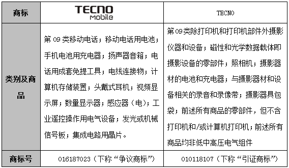 2016年12月21日,TECNO TELECOM (HK) LIMITED向歐盟知識產權局提交了第016187023號“ ”第09類商標注冊申請。2017年08月18日,英國公司PDJ (Shelf 7) Limited在前述商標初審公告期內基于名下第010118107號“TECNO”第09;36;37類在先歐盟注冊商標、援引《歐盟商標條例》第8(1)(b)條即混淆誤認條款對前述商標提出了異議。為此,將雙方商標和商品對比如下表:
