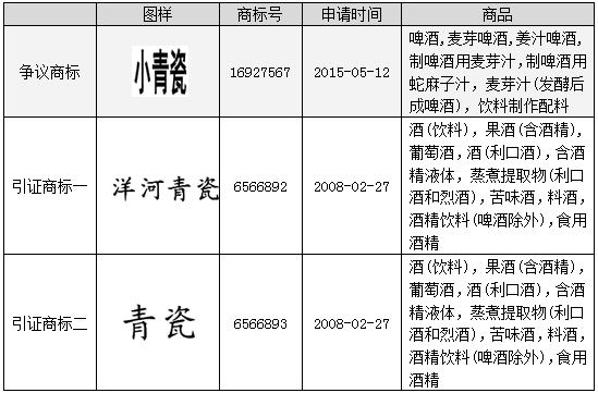 原告江蘇洋河酒廠股份有限公司(以下簡稱“洋河酒廠”)早在2008年,就在第33類“酒(飲料)”等商品上注冊了“洋河青瓷”、“青瓷”商標,并且早在其注冊之前,自1999年開始就在“白酒”商品上開始使用“青瓷”商標。但是,在2015年,英國凱撒啤酒有限公司在第32類“啤酒”等商品上注冊了“小青瓷”商標。因此,洋河酒廠對該商標提出了異議,異議的理由即為訴爭商標與引證商標構(gòu)成類似商品上的近似商標。