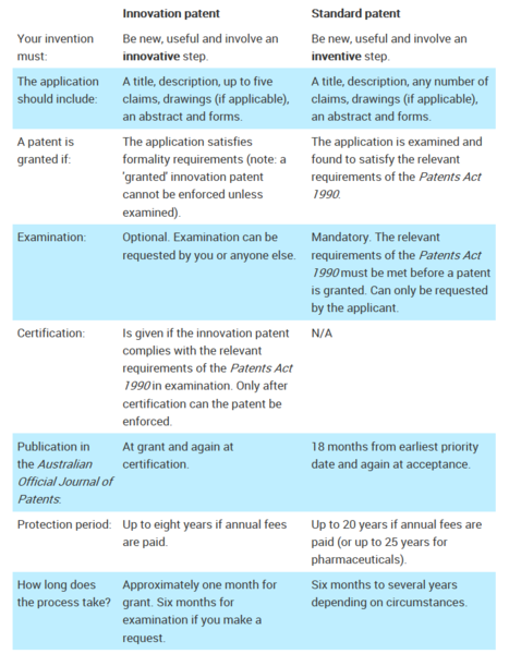澳大利亞專利分為:標(biāo)準(zhǔn)專利Standard patent(類似中國(guó)的發(fā)明)、創(chuàng)新專利innovation patent(類似中國(guó)的實(shí)用新型,但也有較多不同之處)、外觀專利。