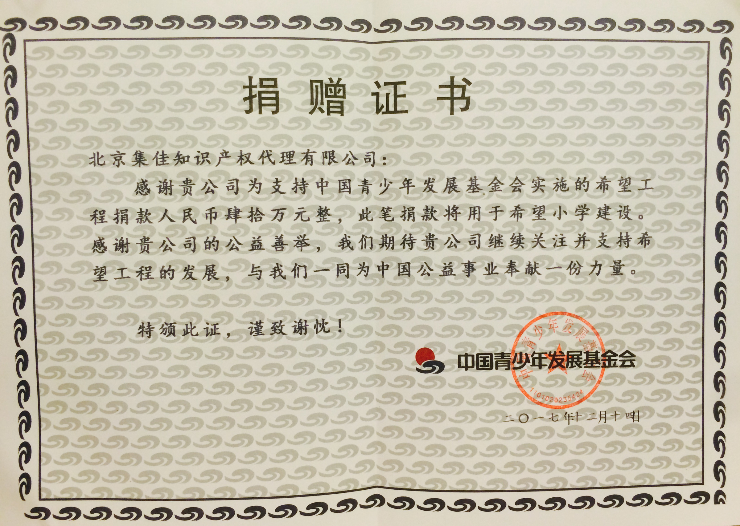 雙旦來(lái)臨之際,集佳也迎來(lái)了一個(gè)好消息。中國(guó)青少年發(fā)展基金會(huì)再一次將援建希望小學(xué)的捐贈(zèng)證書(shū)頒給集佳,表示對(duì)集佳十幾年如一日踐行“一年建一所集佳希望小學(xué)”承諾的感謝。自2006年以來(lái),為了支持中國(guó)青少年發(fā)展基金會(huì)實(shí)施“希望工程”,集佳每年都會(huì)投入專門(mén)款項(xiàng),用于希望小學(xué)建設(shè)。
