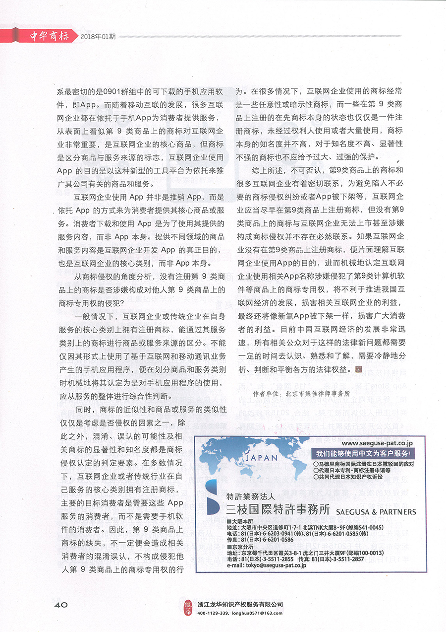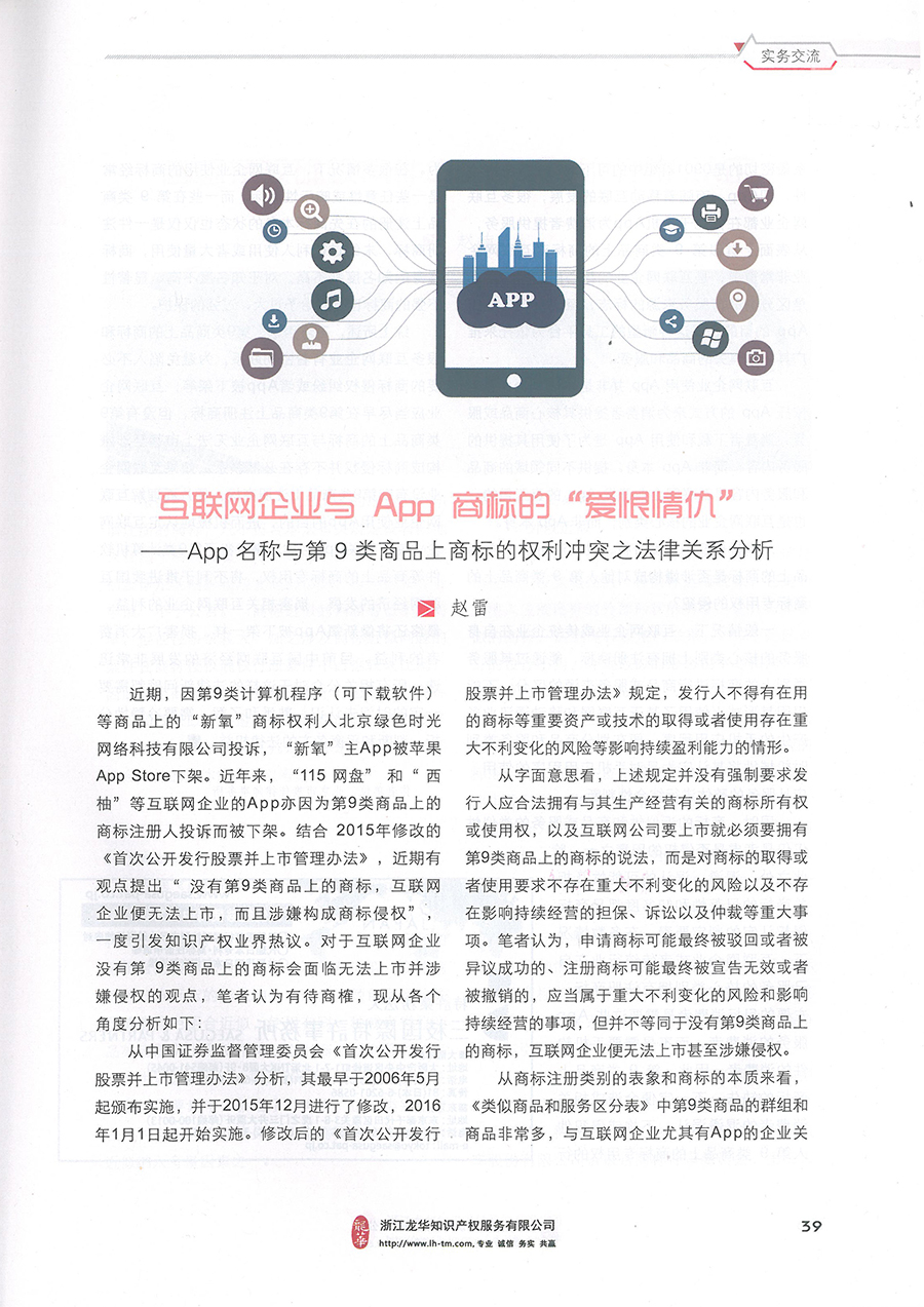 集佳文章《互聯(lián)網(wǎng)企業(yè)與APP商標(biāo)的“愛(ài)恨情仇”》在《中華商標(biāo)》發(fā)表