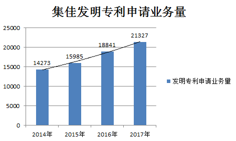 自《北京市專(zhuān)利代理年報(bào)》發(fā)布以來(lái),集佳每年都在不同業(yè)務(wù)領(lǐng)域和不同指標(biāo)排名中保持優(yōu)勢(shì),尤其在發(fā)明專(zhuān)利申請(qǐng)量、有效專(zhuān)利申請(qǐng)量、專(zhuān)利申請(qǐng)業(yè)務(wù)總量等公認(rèn)值得參考的評(píng)價(jià)項(xiàng)目上。在此基礎(chǔ)上,隨著創(chuàng)新引領(lǐng)發(fā)展的趨勢(shì)日益明顯,集佳也在不斷尋求新的突破,從2014年的14273件到2017年的21327件,集佳代理發(fā)明專(zhuān)利申請(qǐng)量也在逐年增加。