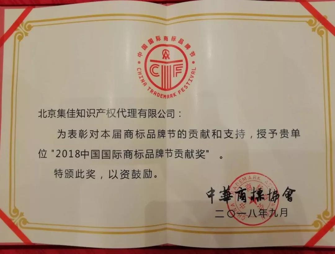 ▲ 集佳榮獲“2018中國(guó)國(guó)際商標(biāo)品牌節(jié)貢獻(xiàn)獎(jiǎng)”