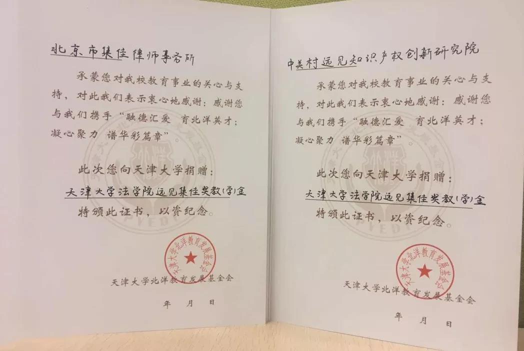 2019年1月中旬,天津大學(xué)北洋教育發(fā)展基金會(huì)又專(zhuān)程給集佳送來(lái)“捐資證書(shū)”,感謝集佳攜手遠(yuǎn)見(jiàn)創(chuàng)新研究院通過(guò)這一公益之舉,支持與資助天津大學(xué)的教育事業(yè)。
