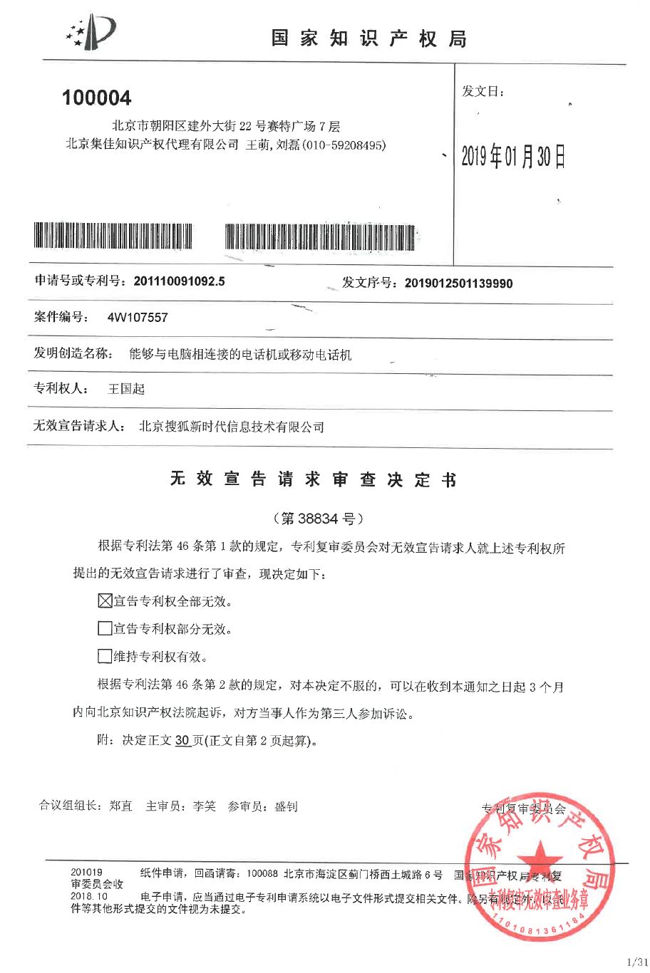 由于存在諸多特殊性,本案受到行業(yè)的高度關(guān)注。集佳公司接受搜狐公司委托,組建經(jīng)驗豐富的專利無效團隊,團隊成員深知該案的重要性,以高標準嚴要求的態(tài)度認真對待無效過程中的每個環(huán)節(jié),從前期對比文件檢索,到無效請求材料的準備,證據(jù)的補充,以及后期的口頭審理,承委托人之信任,擔(dān)盡力成事之責(zé)任,終于實現(xiàn)了委托人搜狐的期望,在新年來臨之前,收到復(fù)審委做出的無效決定。