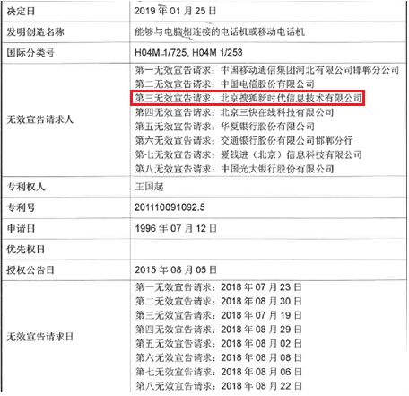 涉案專利名稱為“能夠與電腦相連接的電話機或移動電話機”,基于該專利,專利權(quán)人王國起自封“發(fā)漢字和圖像信息的電話機/移動電話機的全世界首創(chuàng)人”。2018年,王國起同時與中國移動、聯(lián)通、電信、搜狐、蘋果、華為、小米、錘子、農(nóng)行、交行等等30余家企業(yè)發(fā)生專利侵權(quán)行政糾紛,涉案金額共計數(shù)十億元之多。