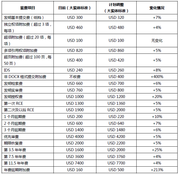 這是美國近三年來首次大范圍上調(diào)官費(fèi),2019年8月初步公告上調(diào)官費(fèi)計(jì)劃時(shí),預(yù)計(jì)是在2021 年1 月實(shí)施,本次公布的最終結(jié)果是提前到2020年10月2日實(shí)施(除非DOCX格式提交附加費(fèi)延后至2022年1月1日實(shí)施外),并對初步計(jì)劃進(jìn)行了略微調(diào)整。