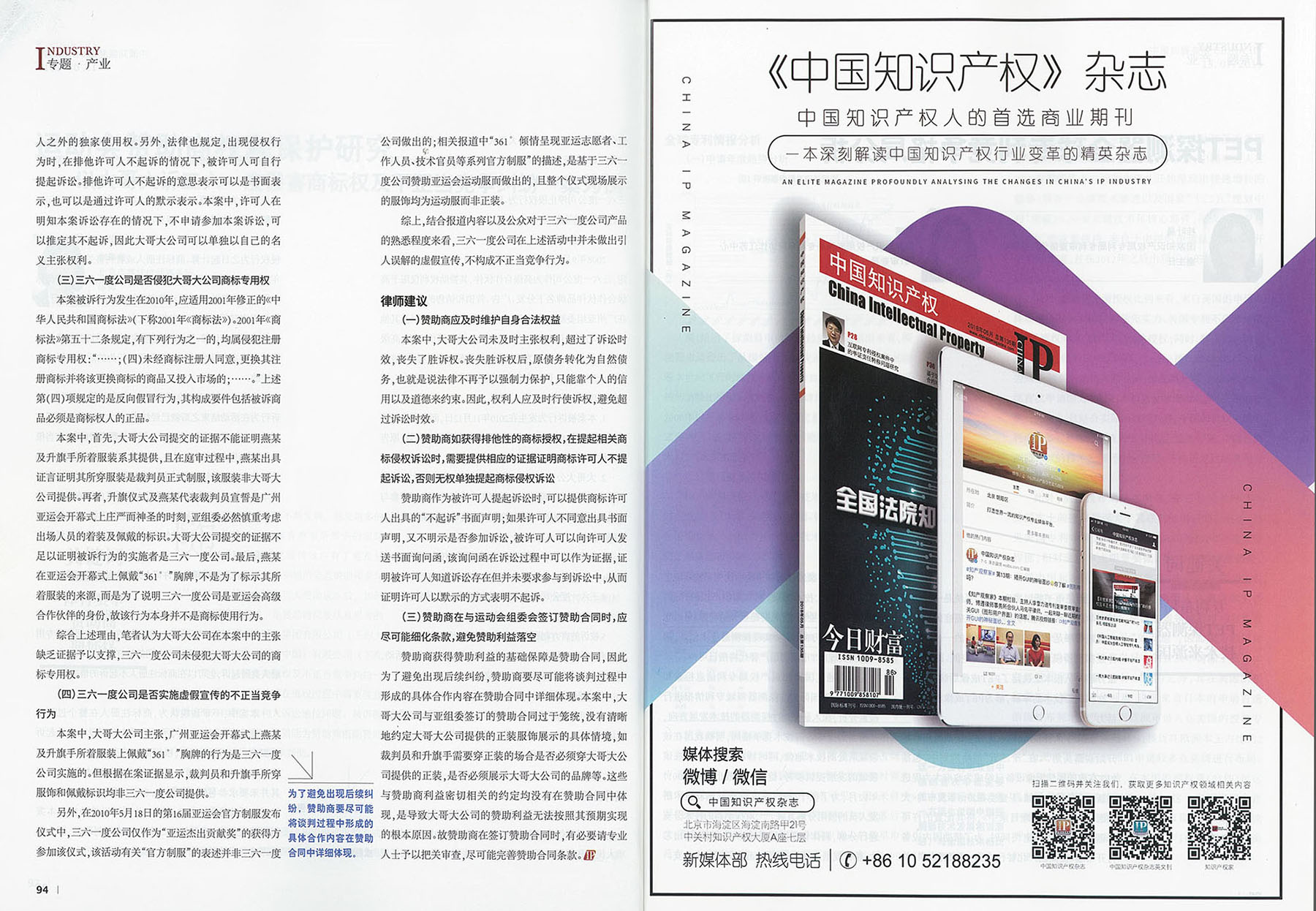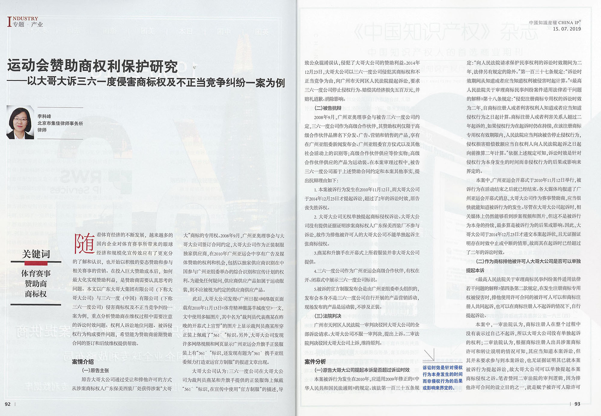 集佳文章《運(yùn)動(dòng)會(huì)贊助商權(quán)利保護(hù)研究——以大哥大訴三六一度侵害商標(biāo)權(quán)及不正當(dāng)競(jìng)爭(zhēng)糾紛一案為例》在《中國(guó)知識(shí)產(chǎn)權(quán)》 發(fā)表