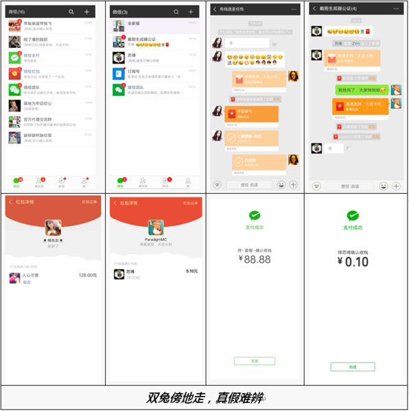 近年來,移動(dòng)應(yīng)用市場(chǎng)上出現(xiàn)一系列以智能生成騰訊微信軟件界面截圖為功能賣點(diǎn)的移動(dòng)應(yīng)用。此種應(yīng)用復(fù)制微信各功能界面的美術(shù)素材并提供相應(yīng)的編輯模塊,使其使用者可通過編輯數(shù)據(jù)內(nèi)容快速、大量生成包括微信對(duì)話記錄、微信紅包記錄、微信支付記錄等多種虛假微信截圖。