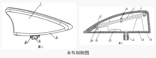 該專利的權(quán)利要求1內(nèi)容為“一種鯊魚鰭式天線,其特征在于具有天線外殼,天線外殼內(nèi)側(cè)上部設(shè)置有無(wú)線電接收天線,無(wú)線電接收天線一端設(shè)有天線信號(hào)輸出端,天線信號(hào)輸出端通過(guò)天線連接元件與天線放大器信號(hào)輸入端相連接,或直接與同軸電纜匹配相連,天線外殼底部裝有安裝底板;所述無(wú)線電接收天線通過(guò)注塑嵌裝或固定卡裝在天線外殼內(nèi)側(cè)上部;在天線外殼內(nèi)側(cè)上部設(shè)置有無(wú)線電接收天線,所述無(wú)線電接收天線采用螺旋狀彈簧天線、或金屬天線,增加了天線接收無(wú)線電信號(hào)的有效長(zhǎng)度,實(shí)現(xiàn)360度全向性信號(hào)接收;所述無(wú)線電接收天線為AM/FM共用天線?!?/p>