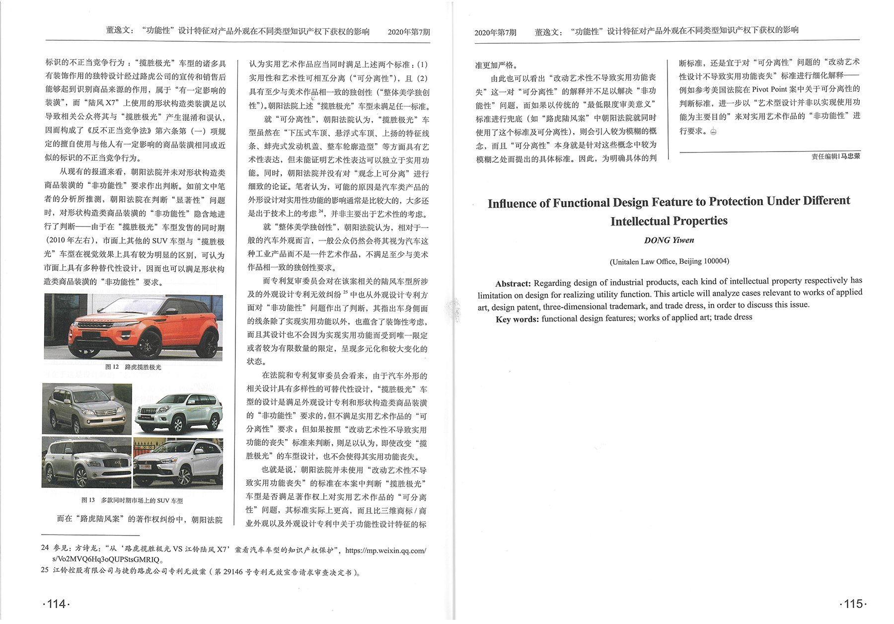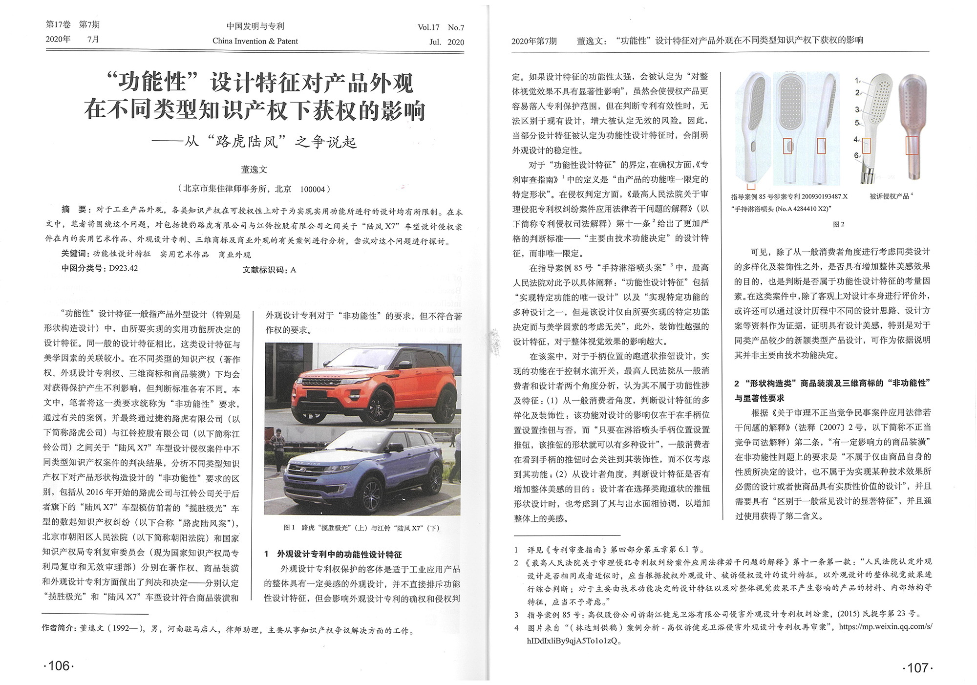 集佳文章《“功能性”設(shè)計(jì)特征對(duì)產(chǎn)品外觀在不同類(lèi)型知識(shí)產(chǎn)權(quán)下獲權(quán)的影響——從“路虎陸風(fēng)”之爭(zhēng)說(shuō)起》在《中國(guó)發(fā)明與專(zhuān)利》發(fā)表