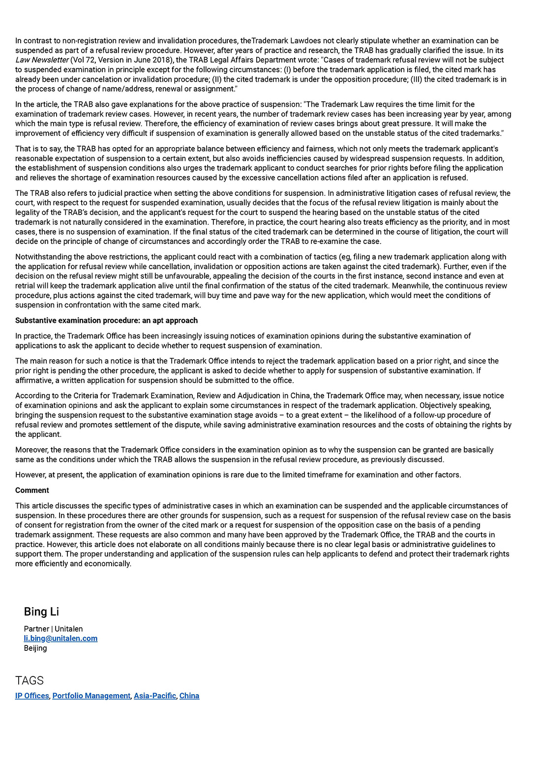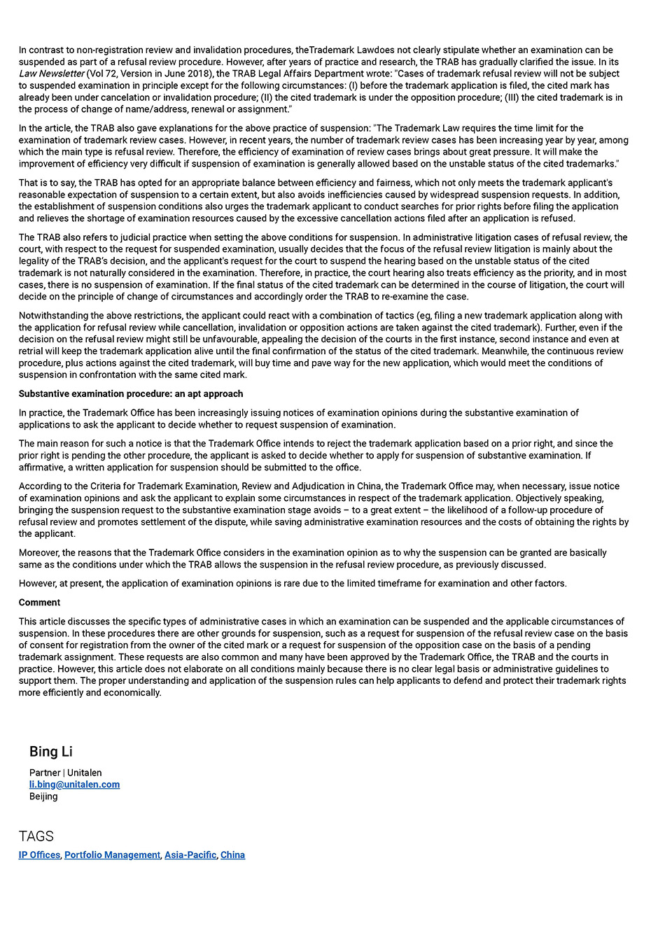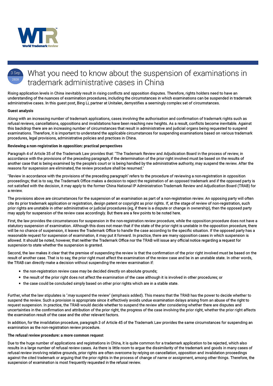 集佳文章《What you need to know about the suspension of examinations in trademark administrative cases in China》在《WTR》發(fā)表