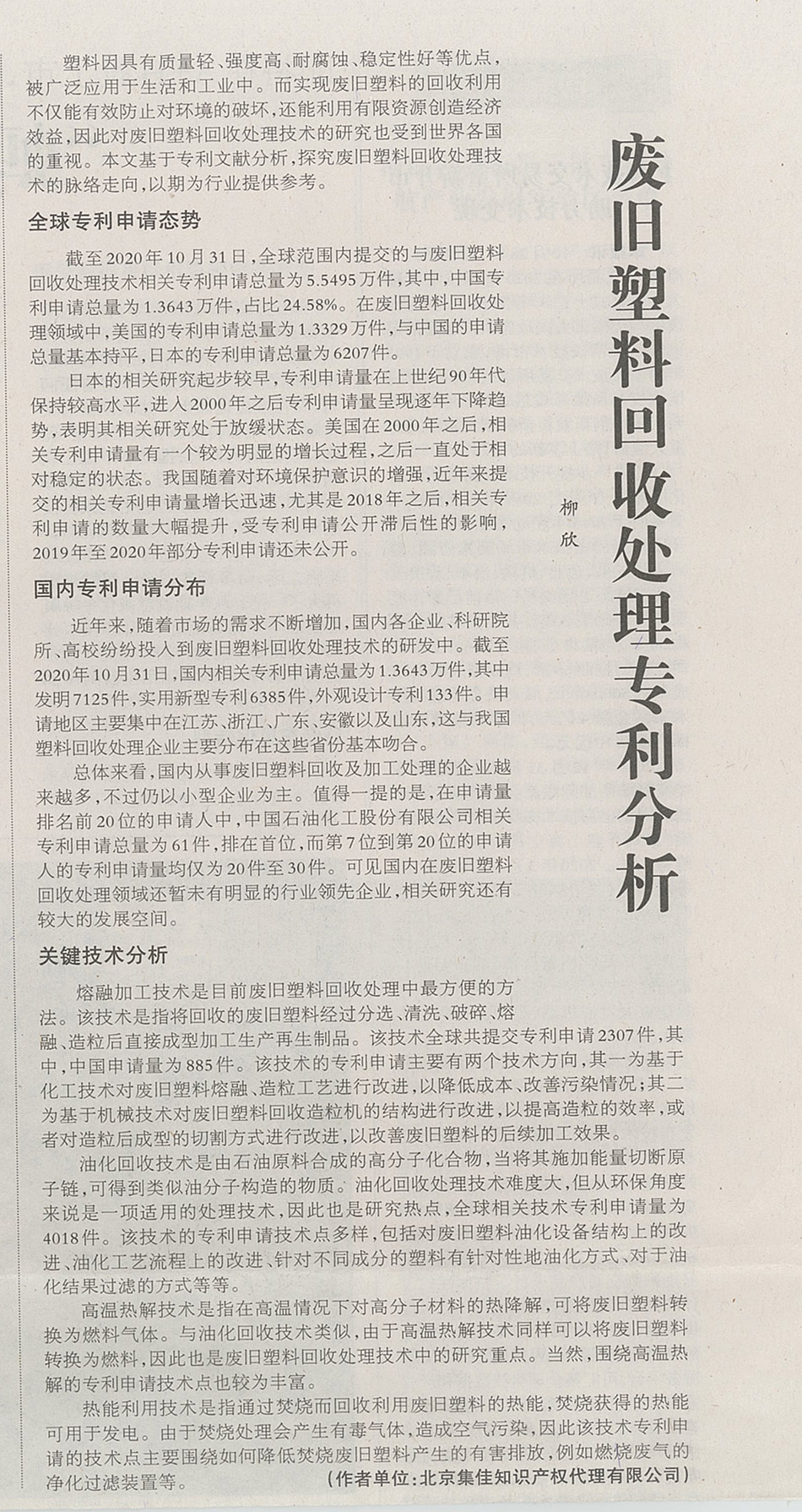 集佳文章《廢舊塑料回收處理專利分析》在《中國(guó)知識(shí)產(chǎn)權(quán)報(bào)》發(fā)表