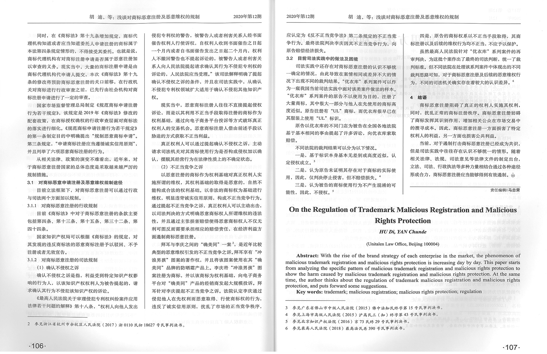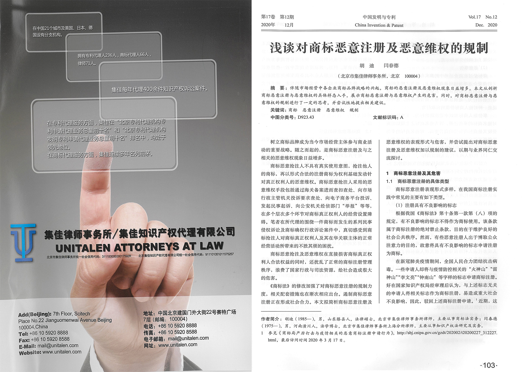 集佳文章《淺談對商標(biāo)惡意注冊及惡意維權(quán)的規(guī)制》在《中國發(fā)明與專利》發(fā)表