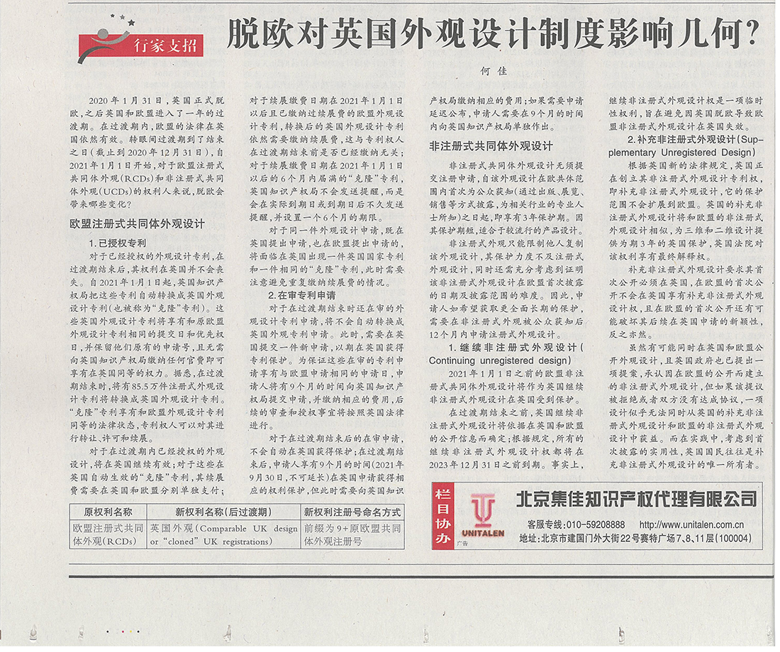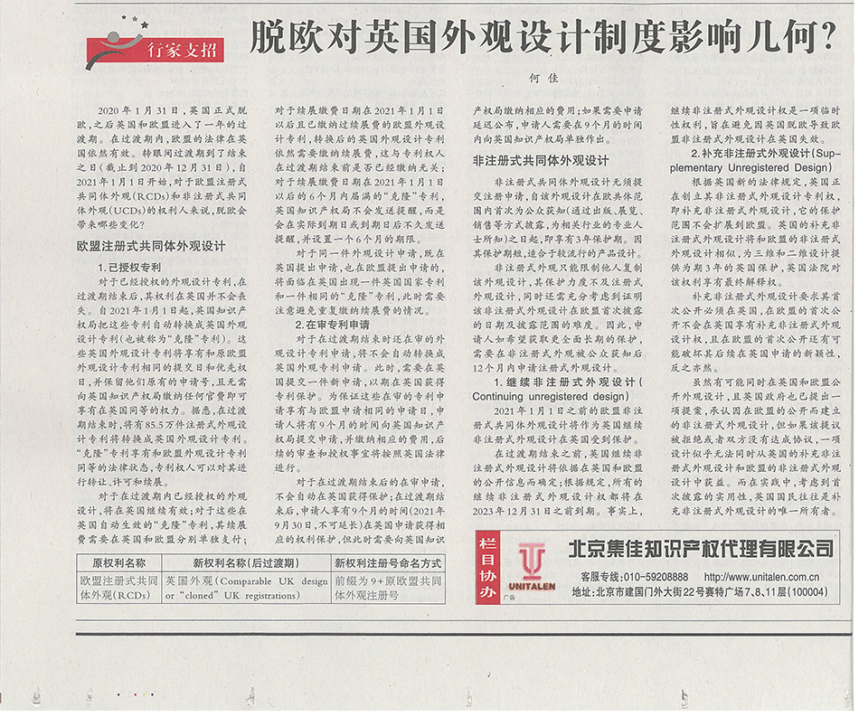 集佳文章《脫歐對(duì)英國外觀設(shè)計(jì)制度影響幾何?》在《中國知識(shí)產(chǎn)權(quán)報(bào)》發(fā)表