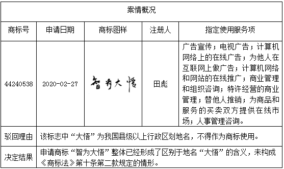 其次,“大悟縣”雖然是隸屬于湖北省孝感市轄區(qū)下的一個(gè)縣級(jí)城市名稱,但其作為縣級(jí)城市名稱并不被廣大消費(fèi)者所熟知,當(dāng)普通消費(fèi)者看到“大悟”二字時(shí),想到是“大悟”二字本身的固有含義,而能夠聯(lián)想到“大悟縣”的可能性不高,其不太可能被普通消費(fèi)者誤認(rèn)是行政區(qū)劃名稱。