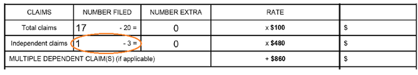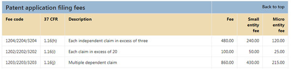 其中大部分項目的費用是固定的,僅取決于申請人的規(guī)模是大實體、小實體還是微實體。有一定操作空間的是申請?zhí)峤粫r的費用(patent application filing fees),其中與權利要求相關的主要是以下幾條: