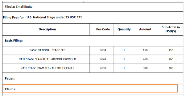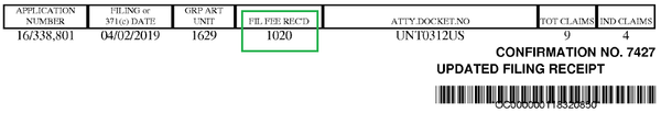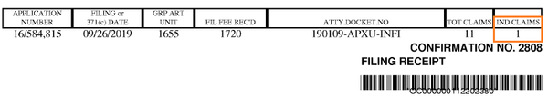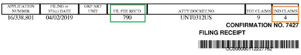 在USPTO發(fā)出的受理通知書上,可以看到官方認定的獨立權利要求數為4,同時顯示官方收到的申請人費用(綠色方框),參見下圖: