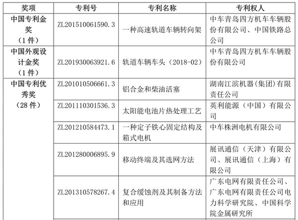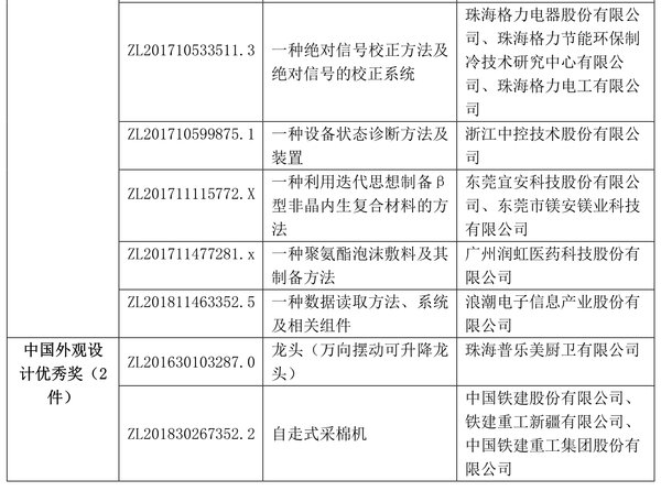 6月25日,國(guó)家知識(shí)產(chǎn)權(quán)局發(fā)布了第二十二屆中國(guó)專(zhuān)利獎(jiǎng)授獎(jiǎng)決定,為30項(xiàng)發(fā)明、實(shí)用新型專(zhuān)利授予中國(guó)專(zhuān)利金獎(jiǎng),10項(xiàng)外觀設(shè)計(jì)專(zhuān)利授予中國(guó)外觀設(shè)計(jì)金獎(jiǎng),60項(xiàng)發(fā)明、實(shí)用新型專(zhuān)利中國(guó)專(zhuān)利銀獎(jiǎng),15項(xiàng)外觀設(shè)計(jì)專(zhuān)利中國(guó)外觀設(shè)計(jì)銀獎(jiǎng),825項(xiàng)發(fā)明、實(shí)用新型專(zhuān)利中國(guó)專(zhuān)利優(yōu)秀獎(jiǎng),56項(xiàng)外觀設(shè)計(jì)專(zhuān)利中國(guó)外觀設(shè)計(jì)優(yōu)秀獎(jiǎng)。