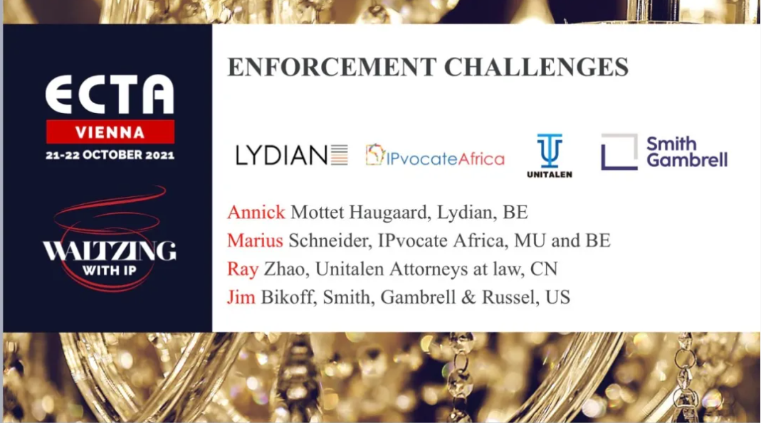 歐洲商標(biāo)協(xié)會(huì)(ECTA)第39屆年會(huì)“與IP共舞”將于2021年10月21-22日在維也納舉行。為了重現(xiàn)ECTA年會(huì)的啟動(dòng)慣例,10月13日,ECTA在線舉行了年會(huì)例行的“周三研討會(huì)”——“商標(biāo)保護(hù)挑戰(zhàn)研討會(huì)”與“WIPO-EUIPO研討會(huì)”,這也是年會(huì)“重要會(huì)議包”內(nèi)容之一。集佳合伙人趙雷律師應(yīng)邀參加商標(biāo)權(quán)保護(hù)挑戰(zhàn)的主題討論,與來(lái)自比利時(shí)的前ECTA主席、Lydian事務(wù)所的高級(jí)合伙人Annick,美國(guó)Smith, Gambrell & Russel事務(wù)所的高級(jí)合伙人Jim,以及毛里求斯IPvocate事務(wù)所的Marius等行業(yè)專(zhuān)家共同探討商標(biāo)權(quán)人在全球各地商標(biāo)權(quán)保護(hù)的挑戰(zhàn)與對(duì)策。