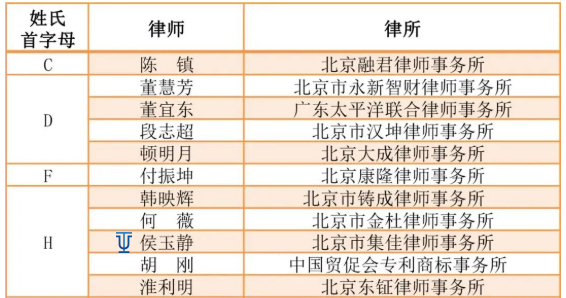 2021年12月16日,由知產(chǎn)力和知產(chǎn)寶聯(lián)合推出的“第三屆中國優(yōu)秀知識(shí)產(chǎn)權(quán)律師榜TOP50”正式公布,北京市集佳律師事務(wù)所合伙人侯玉靜律師榮登榜單,這是侯律師連續(xù)第二年入選。