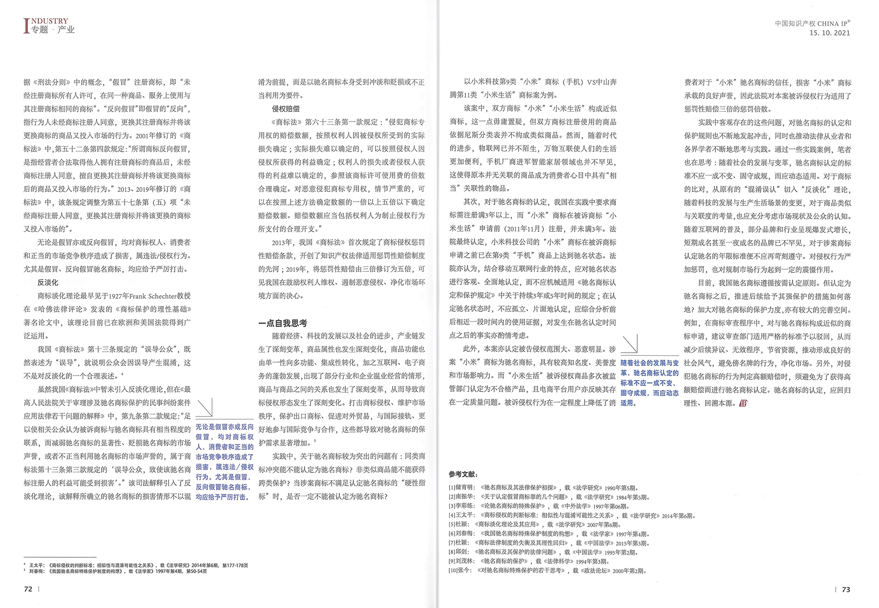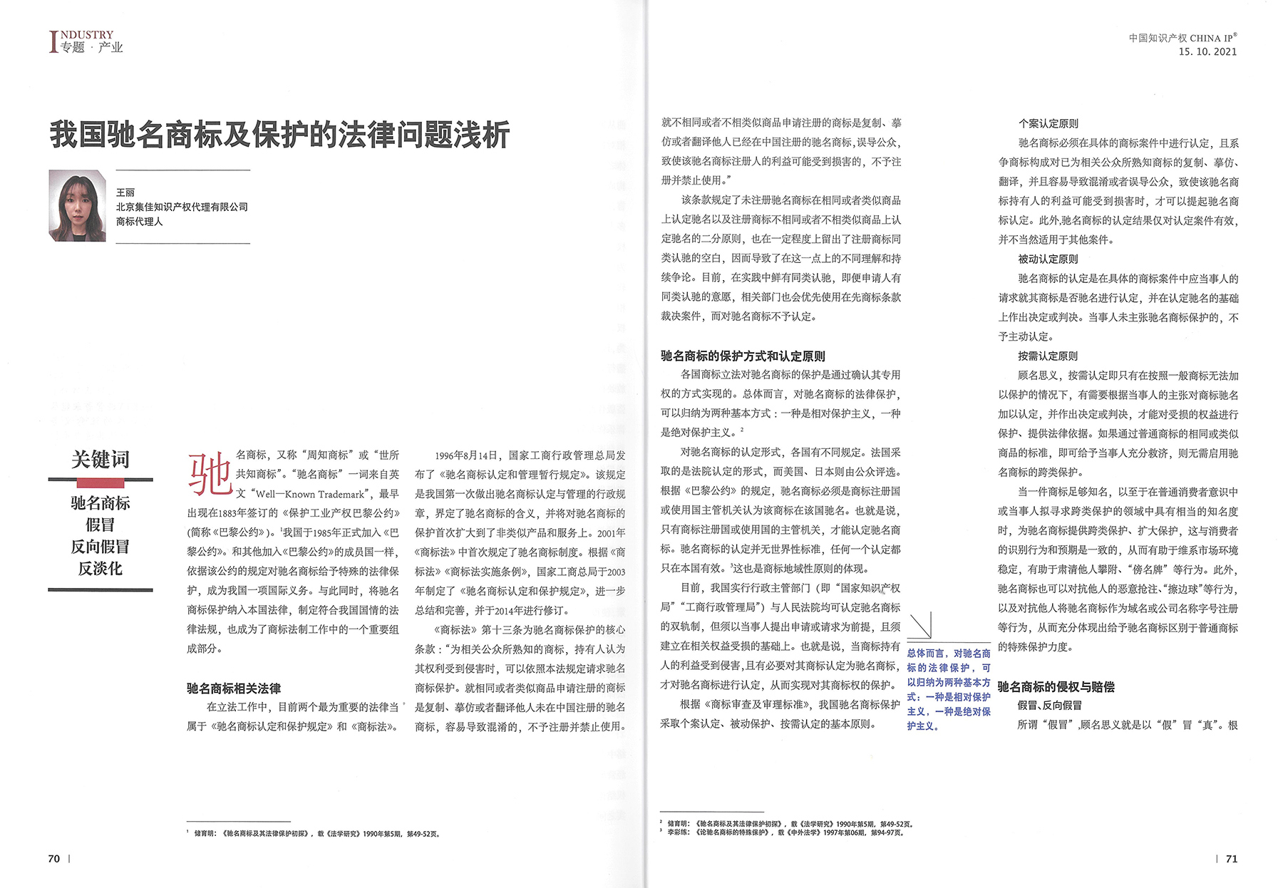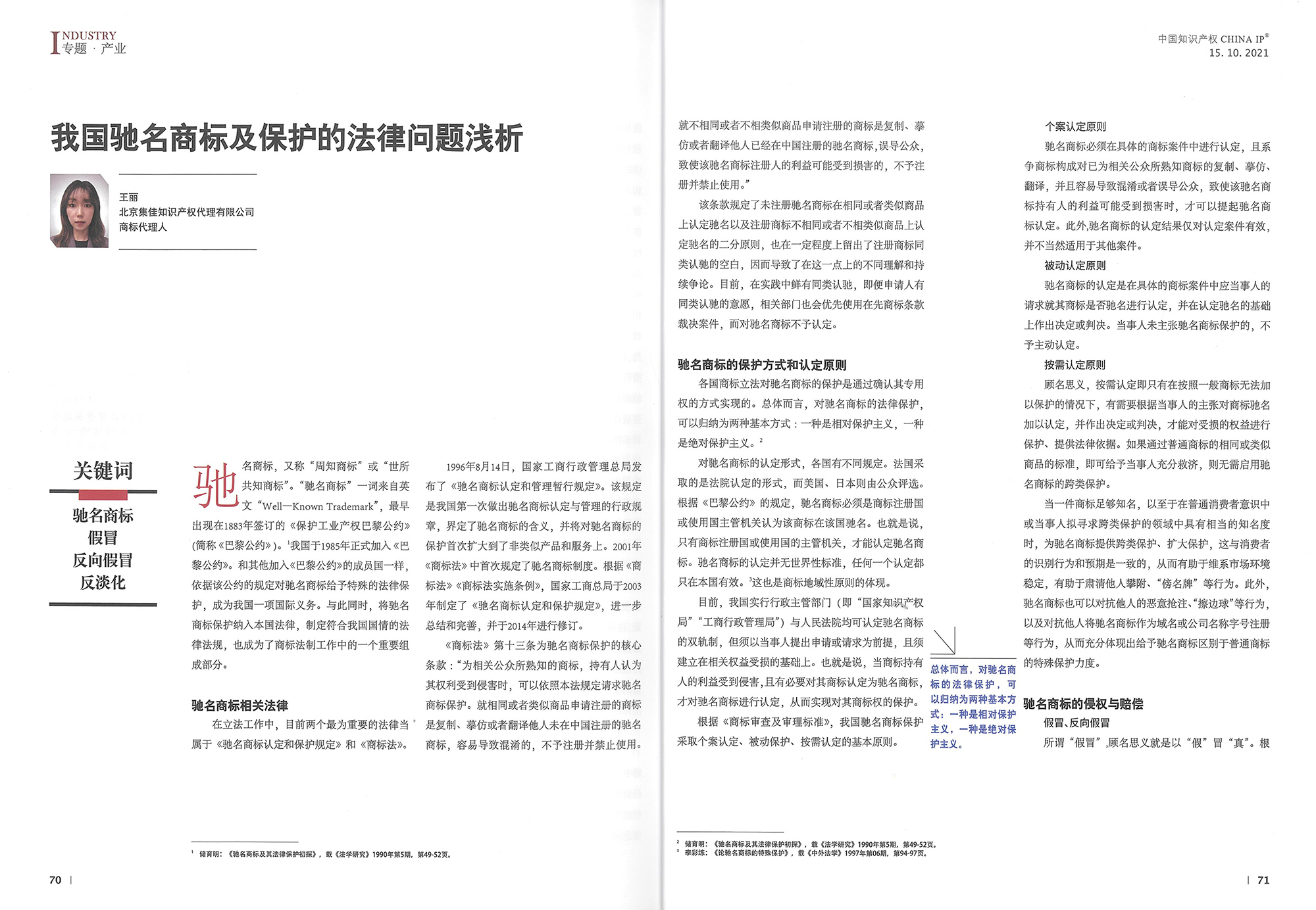 集佳文章《我國馳名商標(biāo)及保護的法律問題淺析》在《中國知識產(chǎn)權(quán)》發(fā)表