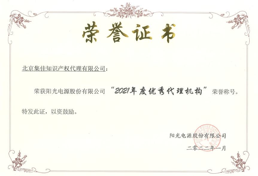 新春伊始,集佳服務(wù)再次喜獲客戶點贊——陽光電源股份有限公司授予集佳“2021年度優(yōu)秀代理機(jī)構(gòu)”榮譽(yù)稱號,并授予集佳專利代理師安淼、胡素莉“2021年度金牌代理師”稱號,陳穎“2021年度新星代理師”稱號。