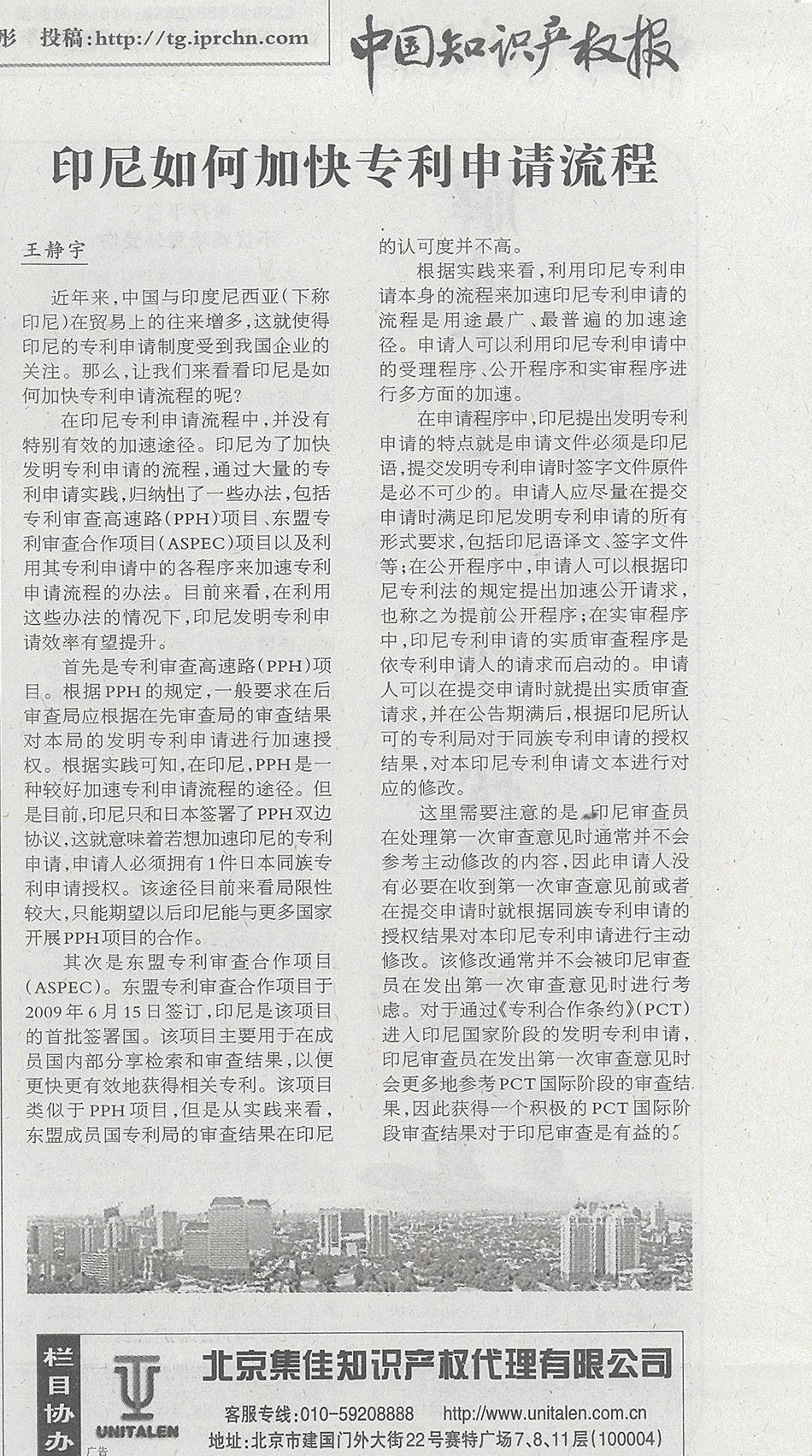 集佳文章《印尼如何加快專利申請(qǐng)流程》在《中國知識(shí)產(chǎn)權(quán)報(bào)》發(fā)表