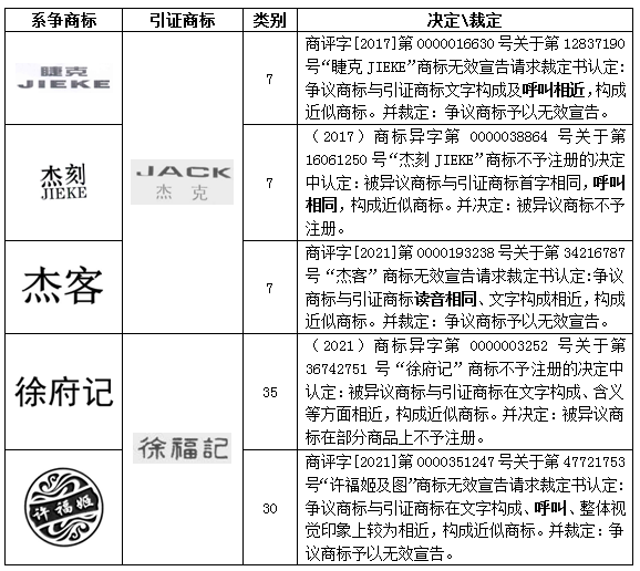 可以看出,上述案件中的系爭商標是對針對“杰克”“徐福記”商標進行的惡意摹仿注冊?!敖芸恕鄙虡藶榻芸丝萍脊煞萦邢薰酒煜碌钠放?,使用在第7類“縫紉機”等商品上,曾被認定為馳名商標,并多次獲得馳名保護?!靶旄S洝睘樾旄S泧H控股集團有限公司旗下品牌,同樣曾被認定為馳名商標,并多次獲得馳名保護。這兩件商標均具有較高的知名度及影響力,也是被其他主體大量惡意摹仿注冊的對象,對于上述惡意摹仿的與“杰克”“徐福記”讀音相同的商標,在異議及無效宣告中均被認定與引證商標近似。