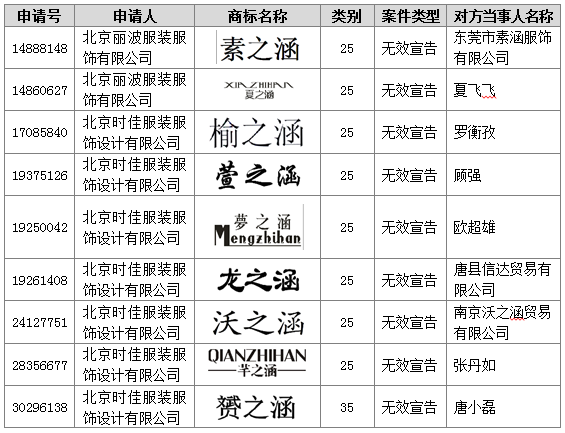 “之涵”為北京時佳服裝服飾設(shè)計有限公司所獨創(chuàng)的品牌,其使用在“服裝”等商品上,該品牌早在2014年1月28日即申請注冊為商標(biāo),并且于2015年3月14日獲得注冊。并且,經(jīng)過時佳公司的大量使用,該品牌已經(jīng)獲得了一定的知名度。尤其是,時佳公司極為注重品牌的保護,針對包含“之涵”的商標(biāo)積極地提出異議或者無效宣告。在大量的無效宣告裁定中,國家知識產(chǎn)權(quán)局均判定“之涵X”或者“X之涵”的商標(biāo)與時佳公司的“之涵”引證商標(biāo)近似。在先案例部分列舉如下: