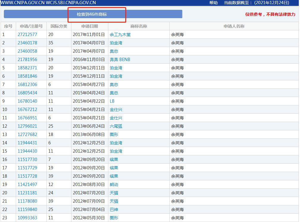 再次,經(jīng)查詢國家企業(yè)信用信息網(wǎng)和愛企查網(wǎng)站,爭議商標(biāo)原注冊人余英海名下無個體工商戶,也并不擔(dān)任任何企業(yè)的法人職務(wù),其不具有經(jīng)營主體的資格,其申請注冊商標(biāo)并獲準(zhǔn)注冊的行為,屬于以商標(biāo)法第四十四條第一款規(guī)定的欺騙手段注冊商標(biāo)的情形。同時,這進(jìn)一步印證了爭議商標(biāo)原注冊人余英海不以使用為目的大量注冊商標(biāo)的情形。