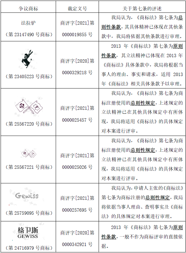 而在過往大多數(shù)異議、無效宣告案件中,“誠實信用原則”都被評價為“總則性條款”或“原則性條款”,例如,下表所列的6件無效宣告案件均將申請人基于第七條的評審請求評述為“總則性條款”,認為誠實信用原則具體精神已體現(xiàn)在其他條款中,案件需依據(jù)其他具體性條款進行評價: