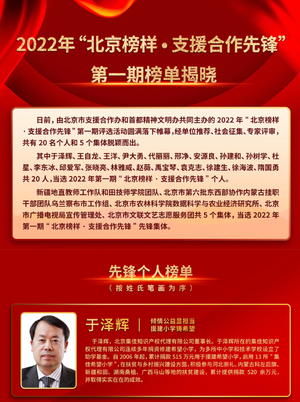 近日,由北京市支援合作辦公室和首都精神文明辦公室共同主辦的2022年“北京榜樣?支援合作先鋒”第一期評選活動圓滿落下帷幕,經(jīng)單位推薦、社會征集、專家評審,共有20名個(gè)人和5個(gè)集體脫穎而出,集佳于澤輝所長榮登“先鋒個(gè)人榜單”!