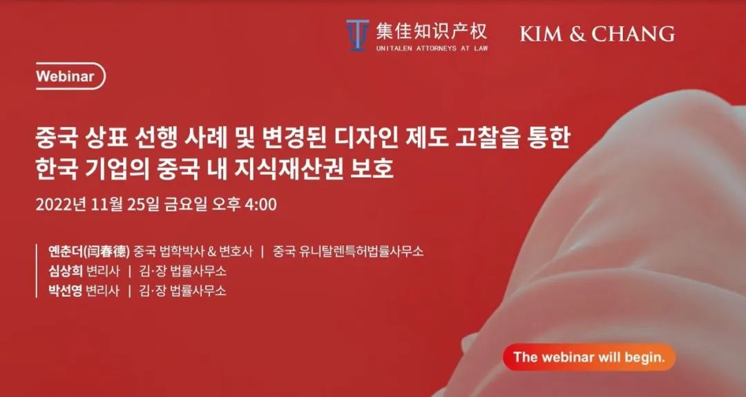 應(yīng)韓國(guó)金張律師事務(wù)所邀請(qǐng),2022年11月25日,集佳合伙人閆春德律師通過(guò)網(wǎng)絡(luò)研討會(huì)形式,為韓國(guó)企業(yè)作“韓企在華知識(shí)產(chǎn)權(quán)維權(quán)”專題講座。合伙人鄭毅律師全程參與本次講座與韓方的溝通與組織協(xié)調(diào)工作。