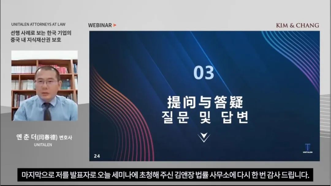 本次講座受到了眾多韓國(guó)知名企業(yè)的歡迎,韓國(guó)電腦游戲公司NEXON(??)、食品企業(yè)希杰第一制糖(CJ????)、DB保險(xiǎn)公司、三星顯示器株式會(huì)社(???????)、速食拉面老牌三養(yǎng)食品(????)、醬類食品代表企業(yè)膳府(??)、化妝品集團(tuán)愛(ài)茉莉太平洋(??????)、高壓電飯煲代表企業(yè)酷晨CUCHEN(??)、醫(yī)美代表企業(yè)科萊西斯CLASSYS(????)、美妝品牌Have&Be(????)等來(lái)自不同行業(yè)企業(yè)的知識(shí)產(chǎn)權(quán)負(fù)責(zé)人以及金張律師事務(wù)所的律師與代理師在線聆聽(tīng)了本次講座。金張律師事務(wù)所表示,會(huì)后大家反響相當(dāng)熱烈,一致認(rèn)為閆律師演講的案例和內(nèi)容非常豐富,對(duì)于理解中國(guó)最新實(shí)務(wù)很有幫助。金張律所表示,期待今后雙方能有更多的合作交流!