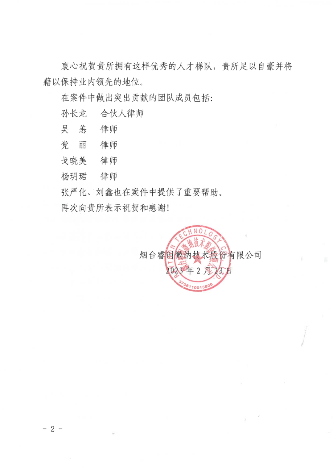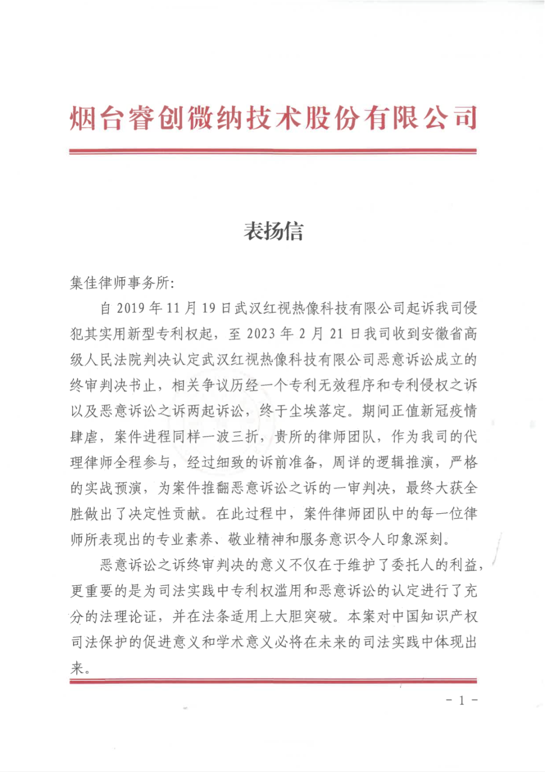 圖1 睿創(chuàng)集團(tuán)向集佳律所寄送的表?yè)P(yáng)信
