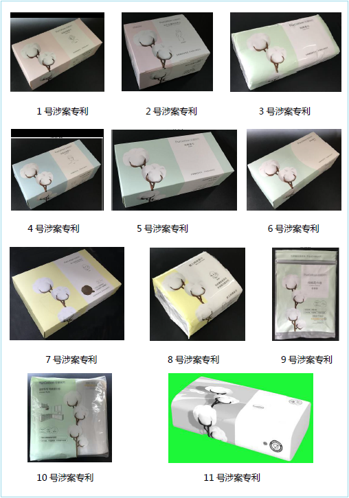 涉案專利均為棉柔巾產(chǎn)品的外包裝盒及外包裝袋,具有相似的設(shè)計(jì)元素和設(shè)計(jì)風(fēng)格。其中,10件專利的申請日為2017年6月5日,1件專利的申請日為2019年1月10日,所有專利均未對外觀設(shè)計(jì)的顏色予以保護(hù)。
