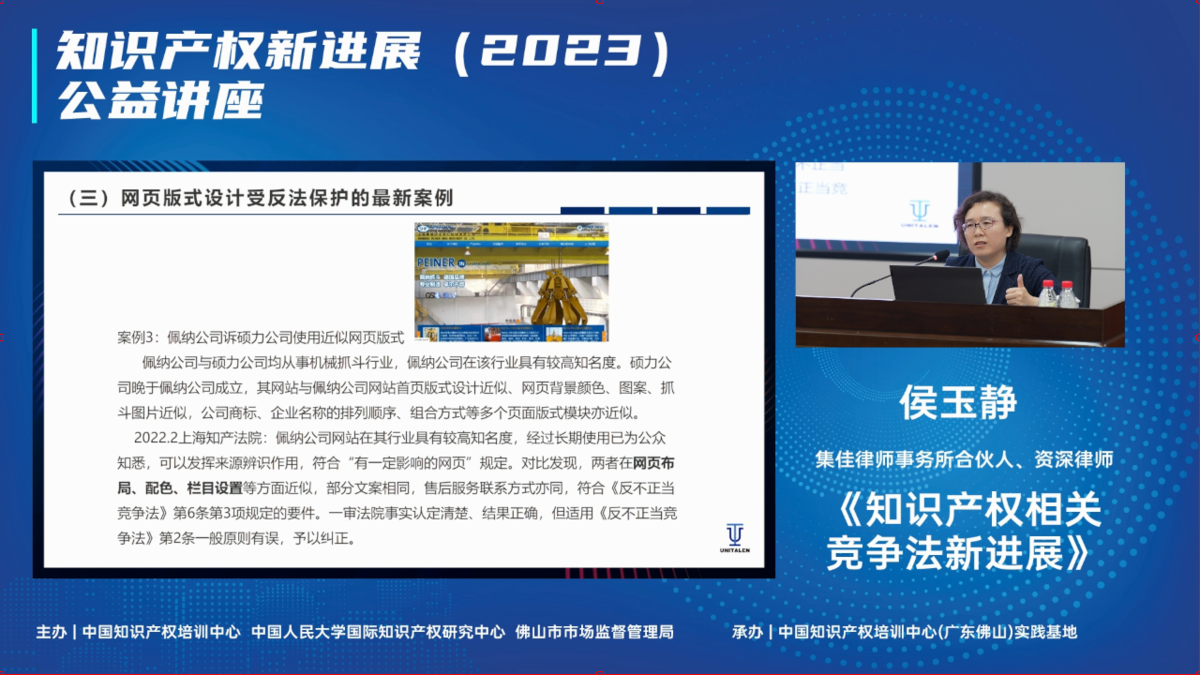 2023年9月7日,由中國知識產(chǎn)權(quán)培訓(xùn)中心、中國人民大學(xué)國際知識產(chǎn)權(quán)研究中心、佛山市市場監(jiān)督管理局聯(lián)合主辦的“知識產(chǎn)權(quán)新進(2023)公益講座”在中國知識產(chǎn)權(quán)培訓(xùn)中心(廣東佛山)實踐基地舉行,集佳合伙人侯玉靜律師應(yīng)邀參加公益講座并發(fā)表主題演講。
